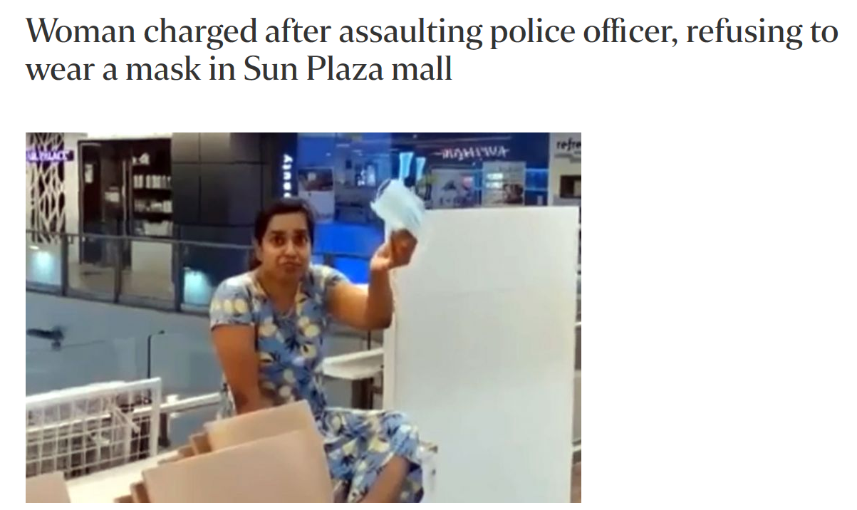 A 40-year-old Singaporean Indian woman at Sun Plaza Mall refused to wear a mask and insulted mall staff and a security officer after being told to wear her mask properly. She even assaulted a police officer who tried to ascertain her identity.