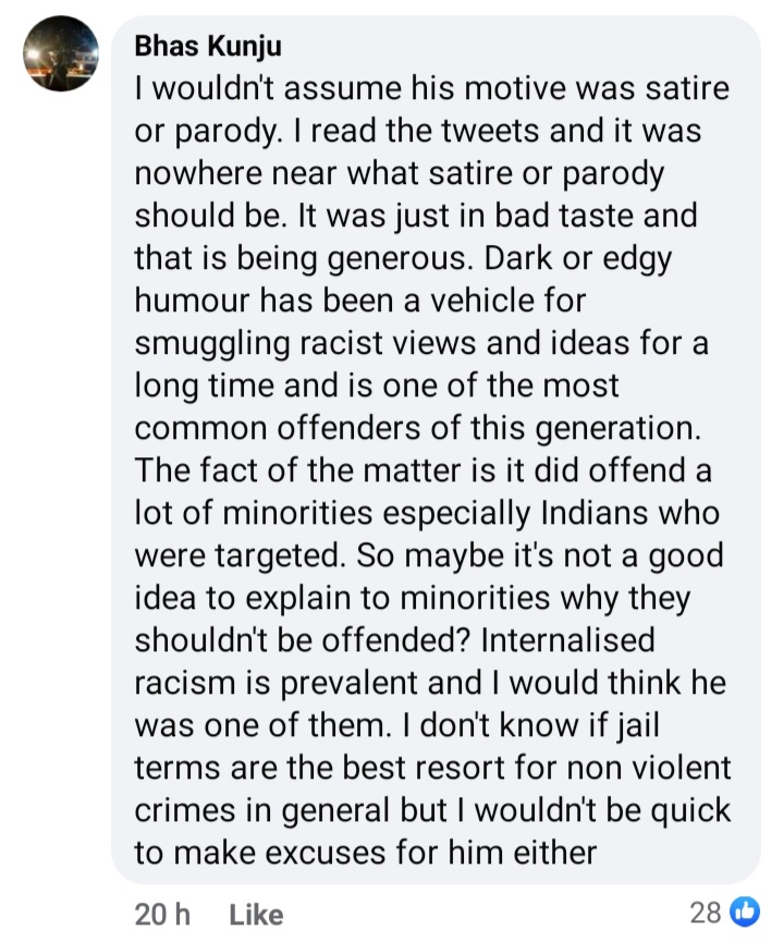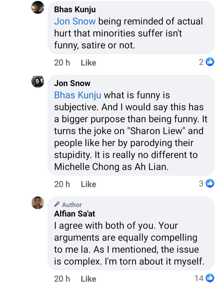 However, not everyone agreed with Alfian’s perspective. FB user “Bhas Kunju” urged them not to be too quick to make excuses for Zainal’s actions, because his tweets offended a lot of minorities and were nowhere near satire. Alfian even admitted that the issue is complex and it may not a straightforward case of dark/edgy humour.