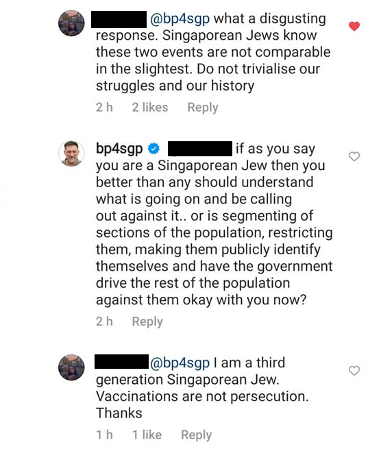Naturally, this did not sit well with fair minded Singaporeans, who decided to rebuke him, with some calling his post “deeply offensive and just plain wrong”, noting that it was illogical to compare the persecution and mass murder of people for being Jewish, with public health measures to manage the COVID pandemic.