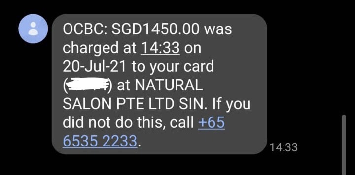 However, Tiew did not check the receipt after making payment at the hair salon, and headed back to work. Shortly after arriving at work, Tiew got a nasty shock, when he received a SMS from OCBC bank informing him that he had been charged a total of $1450 for the hair services, instead of just the $228 agreed.