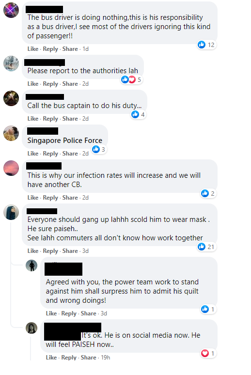 The video has since attracted a flurry of comments from angry netizens, with some saying that the bus captain should have been informed, and that he should take action against this errant passenger. Others said that it was the responsibility of good citizens to gang up on the errant passenger and force him to wear his mask properly.