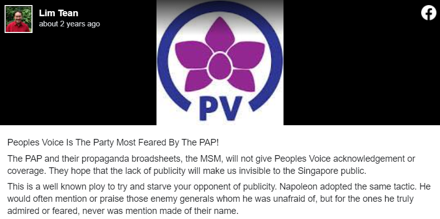 It certainly proves that Lim Tean has very thick skin, a fact that Lim Tean first made know to the public when he made a statement on the People’s Voice Facebook page, that the political party he founded (Peoples Voice) was the PAP’s worst fear in Dec 2019.