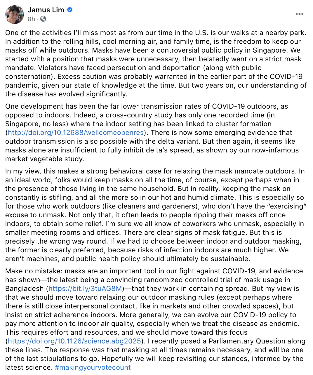 In a Facebook post he made yesterday (21st Sep), Jamus Lim said that there is a case for relaxing outdoor masking rules.