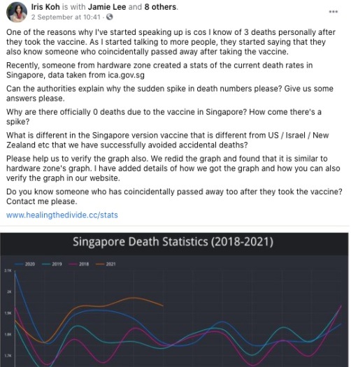 The founder of the group is Iris Koh. She has been vocal about being against the COVID vaccines, frequently claiming that she “know of 3 deaths personally after they took the vaccine.”