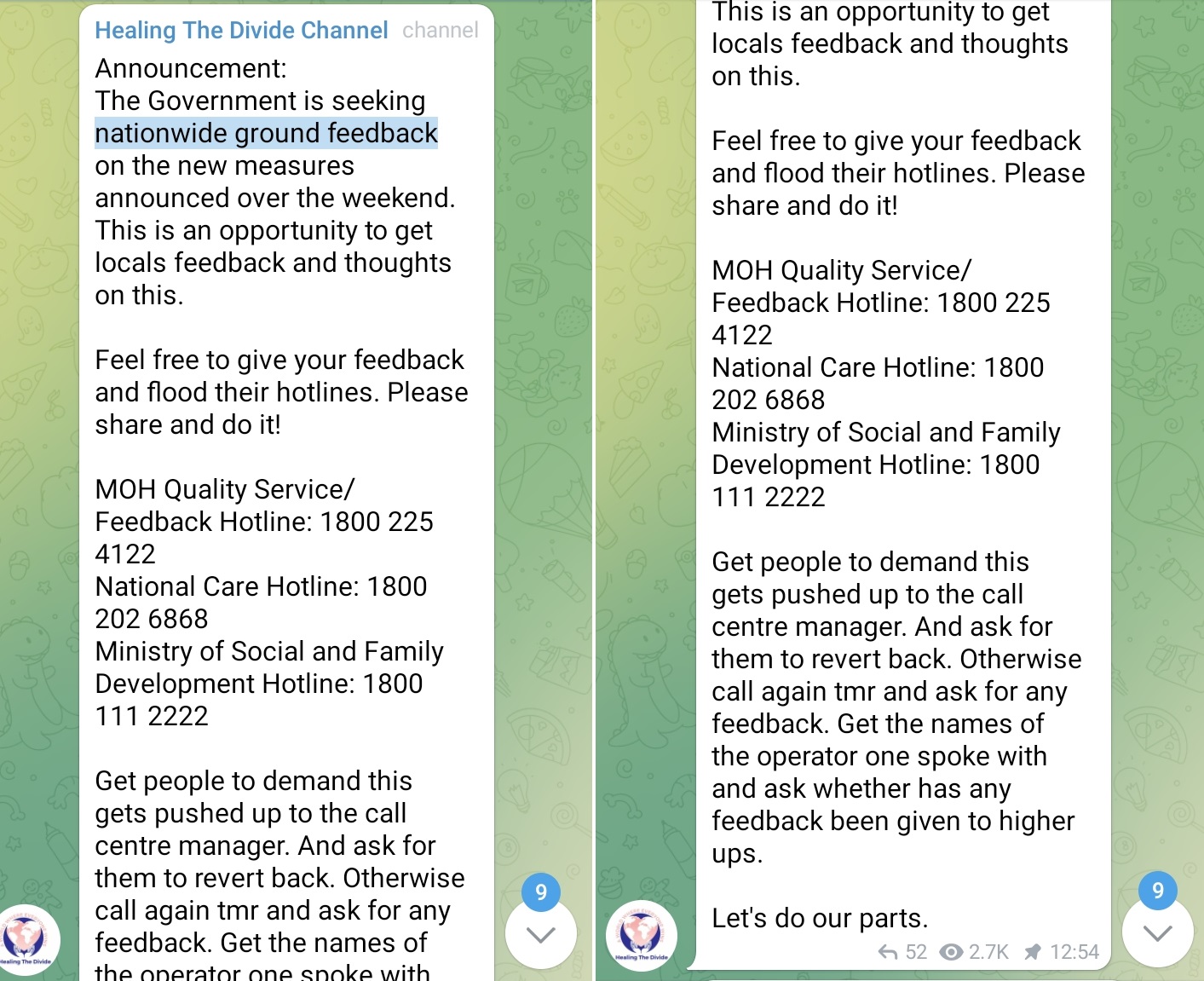 “Healing The Divide” is a group made of Singaporeans who are concerned about Covid-19 vaccines. Just last weekend, the group broadcasted a message onto their Telegram channel urging their followers to flood MSF/MOH hotlines and mental health support National Care Hotline.
