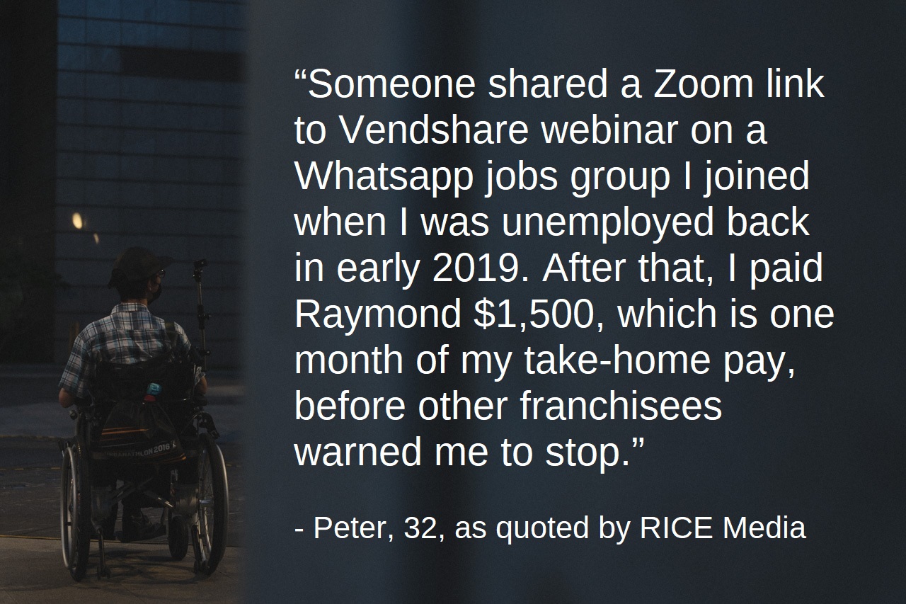 Several franchisees also said on the Scamsg.com website that they have yet to receive any payout from Mr Ng or Vendshare months, or even years, after they paid the deposits.