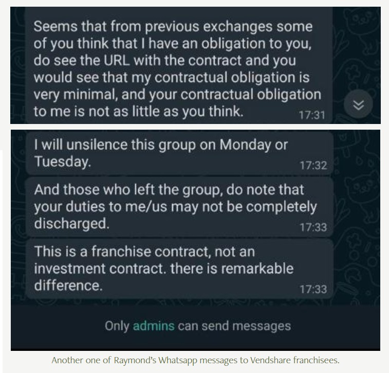 According to RICE Media, when the franchisees started demanding for answers, Raymond threatened to bring lawsuits for defamation and breach of contract, and severed communication by kicking them out of the franchisee Whatsapp group chat.