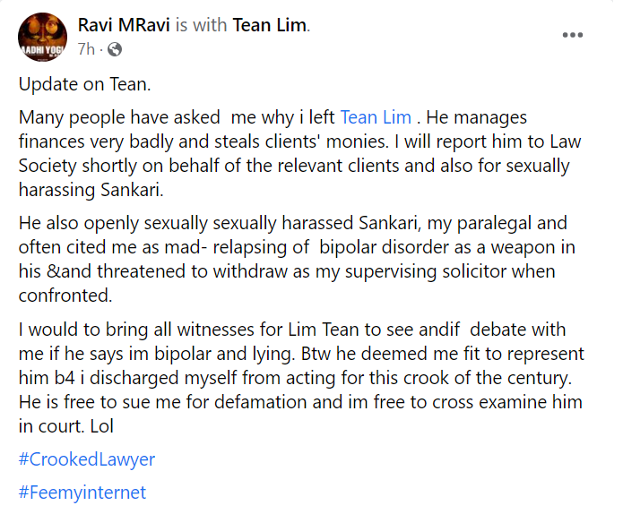 M Ravi ended the post by saying that he has discharged himself from acting for Lim Tean, the crook of the century, and that Lim Tean is free to sue him in court.