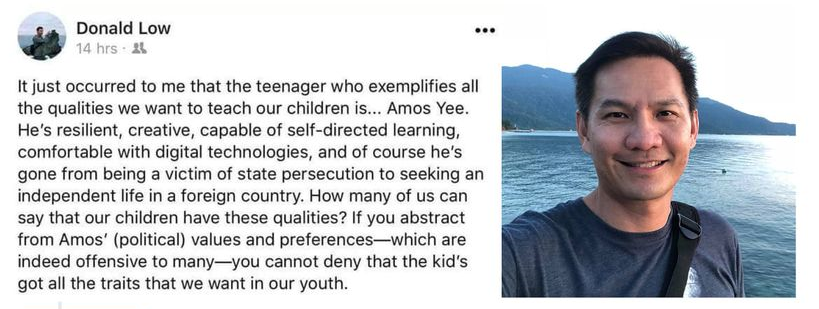 Several notable Singaporeans also joined in and supported Amos Yee. Singaporean academic and economist Donald Low was quoted as saying that “Amos Yee exemplifies all the qualities we want to teach our children”, and that Amos Yee has “all the traits that we want in our youth.”