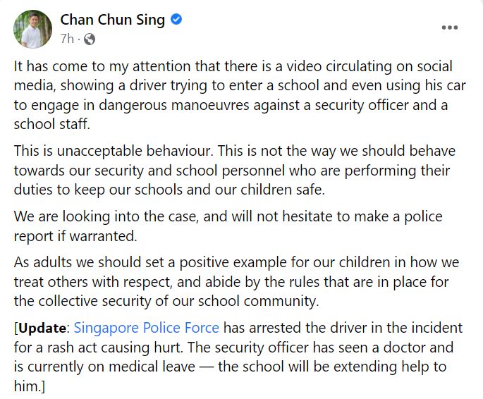 It wasn’t long before Minister for Education Mr Chan Chun Sing, responded to the video, vowing that MOE will investigate the matter, and condemned the act of the Bentley driver.