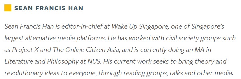 Sean Francis Han was the former editor-in-chief at WUSG, he claimed to have left WUSG since 8 September 2021. He was one of the activists who held a silent protest on the MRT by wearing blindfolds and holding up the book “1987: Singapore’s Marxist Conspiracy 30 years on”.