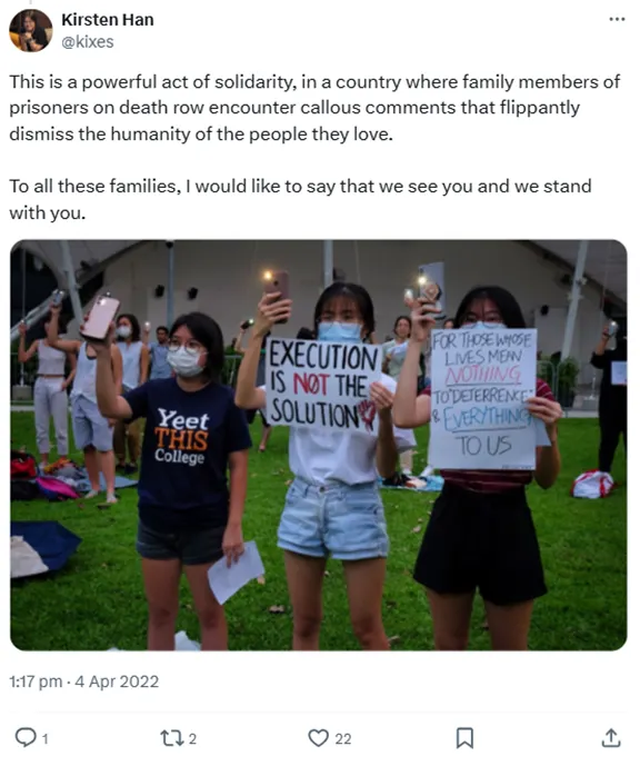 Let’s lay it bare. Kirsten Han, the veteran journalist-activist, and Suraendher Kumarr, the NUS alum turned full-time rabble-rouser, are deeply intertwined in the anti-capital punishment crusade. They tell students and young people to join protests against the death penalty. Suraendher is often there too, talking to young people or helping out. Their group, TJC, even has a student wing called SATU that gets kids from our universities to join these events.